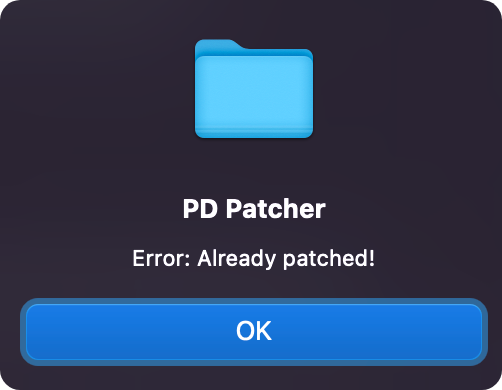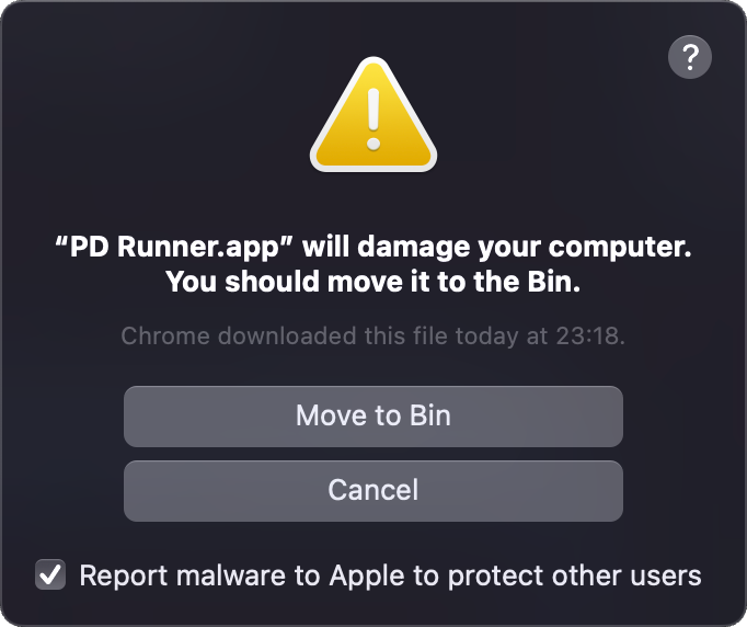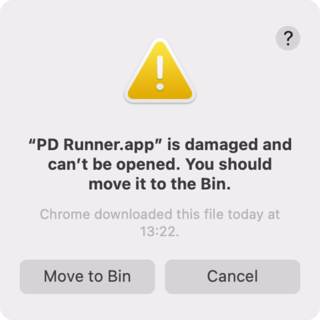 If you get an error message as shown in the picture above please uninstall the PD Runner app from the Applications folder and then run the following command in Terminal as admin. Lastly, install the latest PD Runner app from the releases section of this repository and it will work normally again.